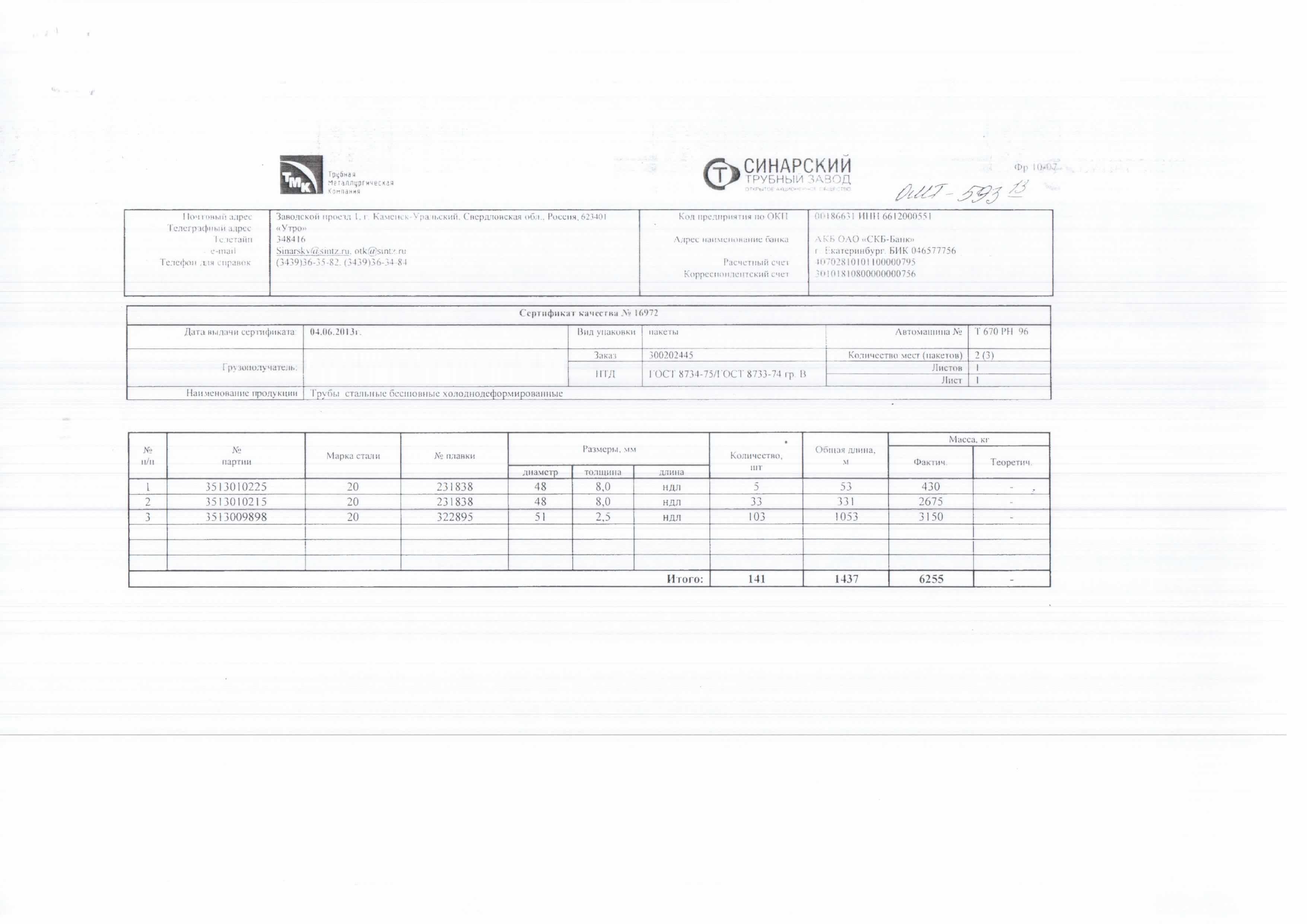 С каждой товарной позицией мы предоставляем все сертификаты и паспорта качества, а также товарно-транспортную накладную.